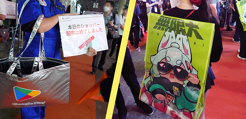 続いてショッパーを物色します。会場内を散策・試遊しているとどんどんノベルティが増えていくので、「持ちやすいショッパーを入手できるかどうか」がこの後の快適さを左右します。中でも今回目立っていたのはGoogle Play(素材が良い感じ)と『無限大ANANTA』(なんとリュック式!)のショッパー。どちらも早々に配布終了していました。