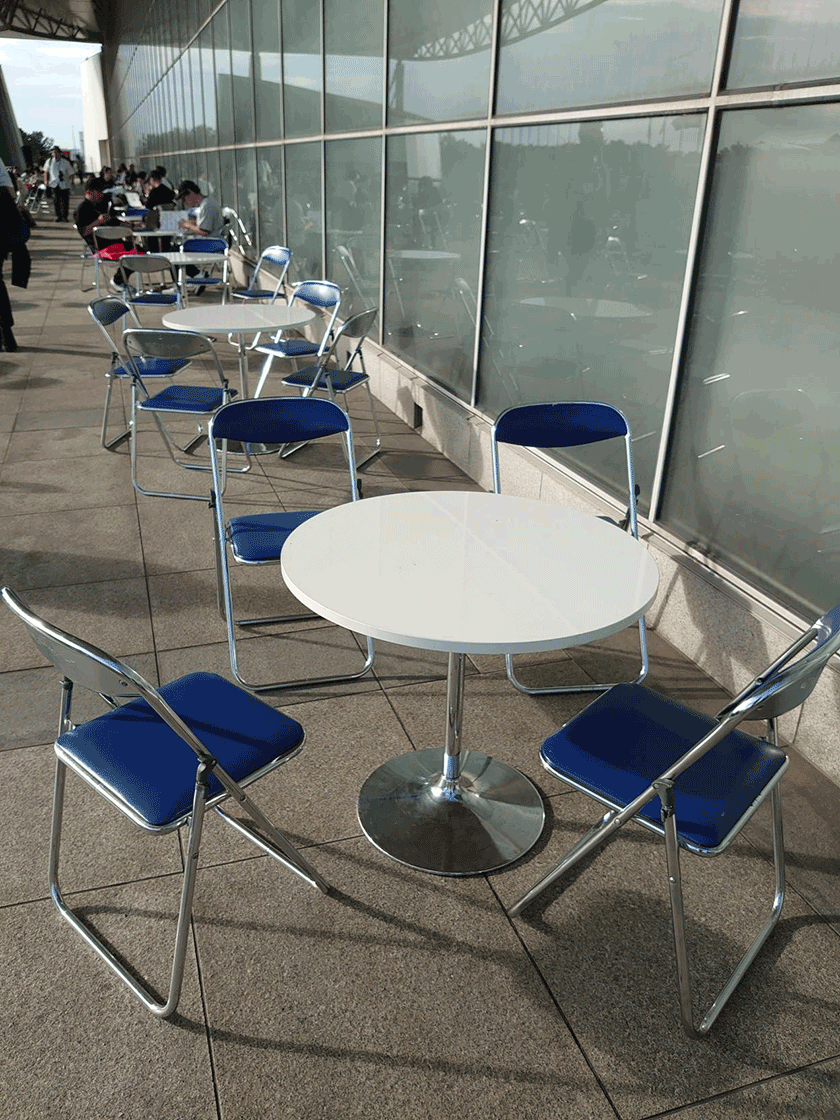 昼休憩は別棟の外スペースへ。メイン棟のキッチンカースペースは激混みですが、こちらは穴場で、昼食時でもテーブルが普通に空いています。