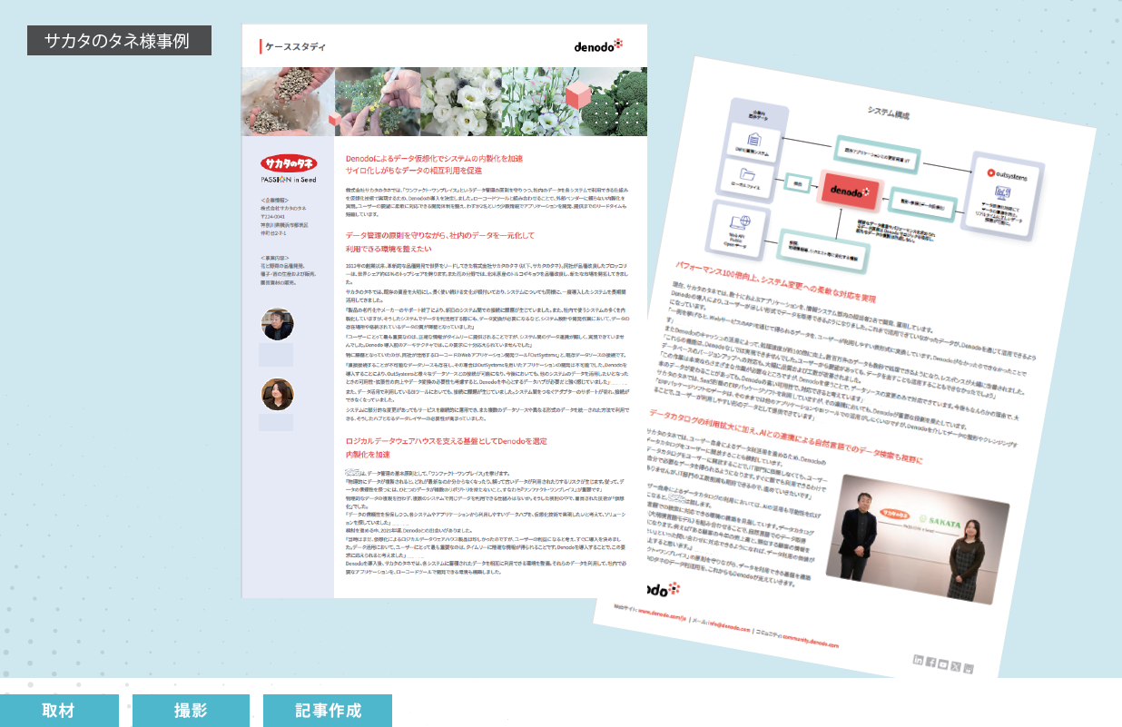 | グローバルで公開されているケーススタディは海外企業の事例が中心で、日本市場における訴求力が十分とは言えなかった。国内シェア拡大に向けて、日本で知名度のある企業のケーススタディが必要だった。 | 取材内容に合わせて専門知識を有するライターを選定し、事前にDenodo Technologies様のセールス担当と打ち合わせを実施。国内導入企業を訪問し、対面でのインタビューから写真撮影、記事執筆の対応を提供しました。 | ライターが、製品やクライアント様の課題などを深く理解した上でインタビューしてくれたので、ほぼ直しの手間なく完成まで進むことができました。ケーススタディを見て、詳しく話を聞きたいと言ってくださるお客様も増え、効果的なマーケティングツールとなりました。 |